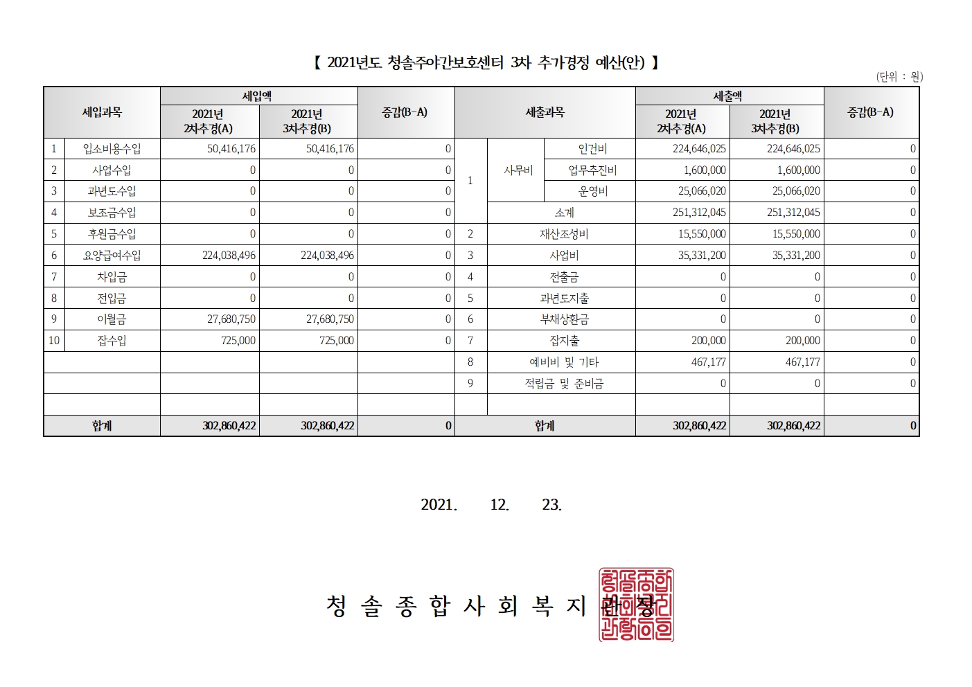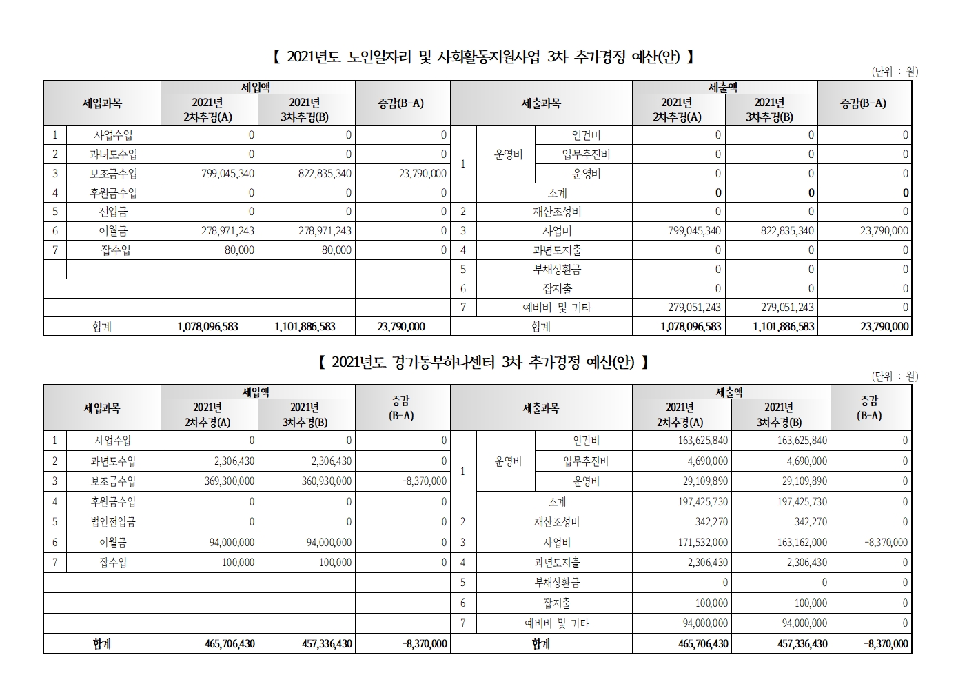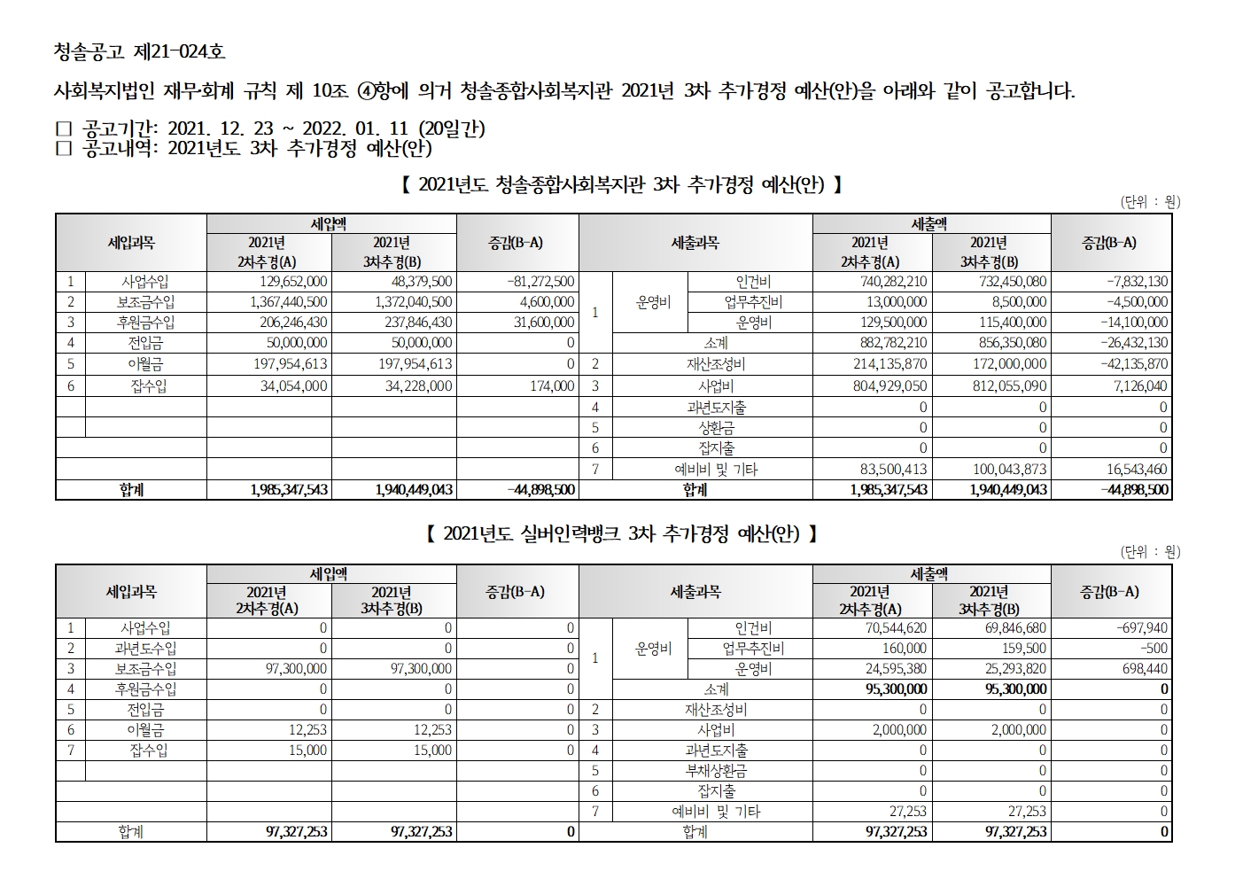 »çȸº¹Áö¹ýÀÎ À繫․ȸ°è ±ÔÄ¢ Á¦ 10Á¶ ¨êÇ׿¡ ÀǰŠû¼ÖÁ¾ÇÕ»çȸº¹Áö°ü 2021³â 3Â÷ Ãß°¡°æÁ¤ ¿¹»ê(¾È)À» ¾Æ·¡¿Í °°ÀÌ °ø°íÇÕ´Ï´Ù.