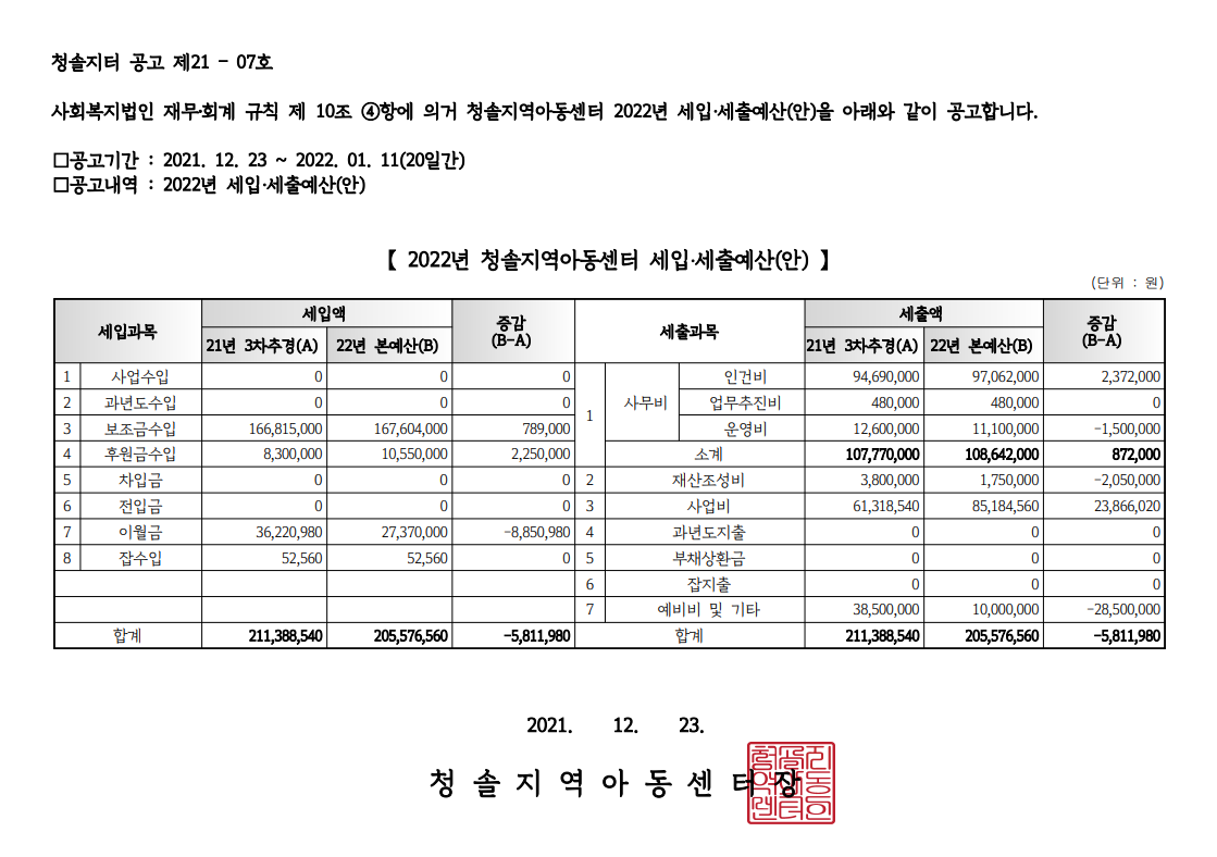 »çȸº¹Áö¹ýÀÎ À繫․ȸ°è ±ÔÄ¢ Á¦ 10Á¶ ¨êÇ׿¡ ÀǰŠû¼ÖÁö¿ª¾Æµ¿¼¾ÅÍ 2022³â ¼¼ÀÔ¼¼Ã⿹»ê(¾È)À» ¾Æ·¡¿Í °°ÀÌ °ø°íÇÕ´Ï´Ù.