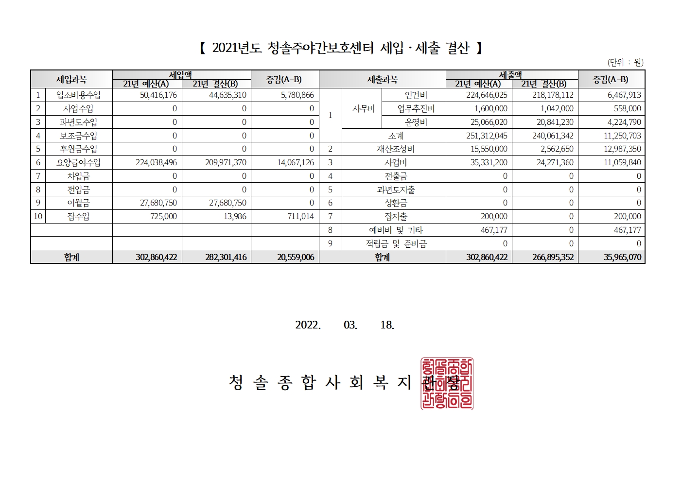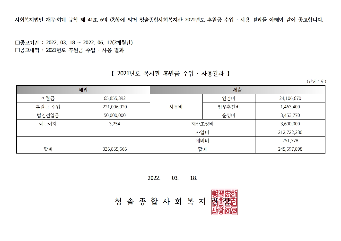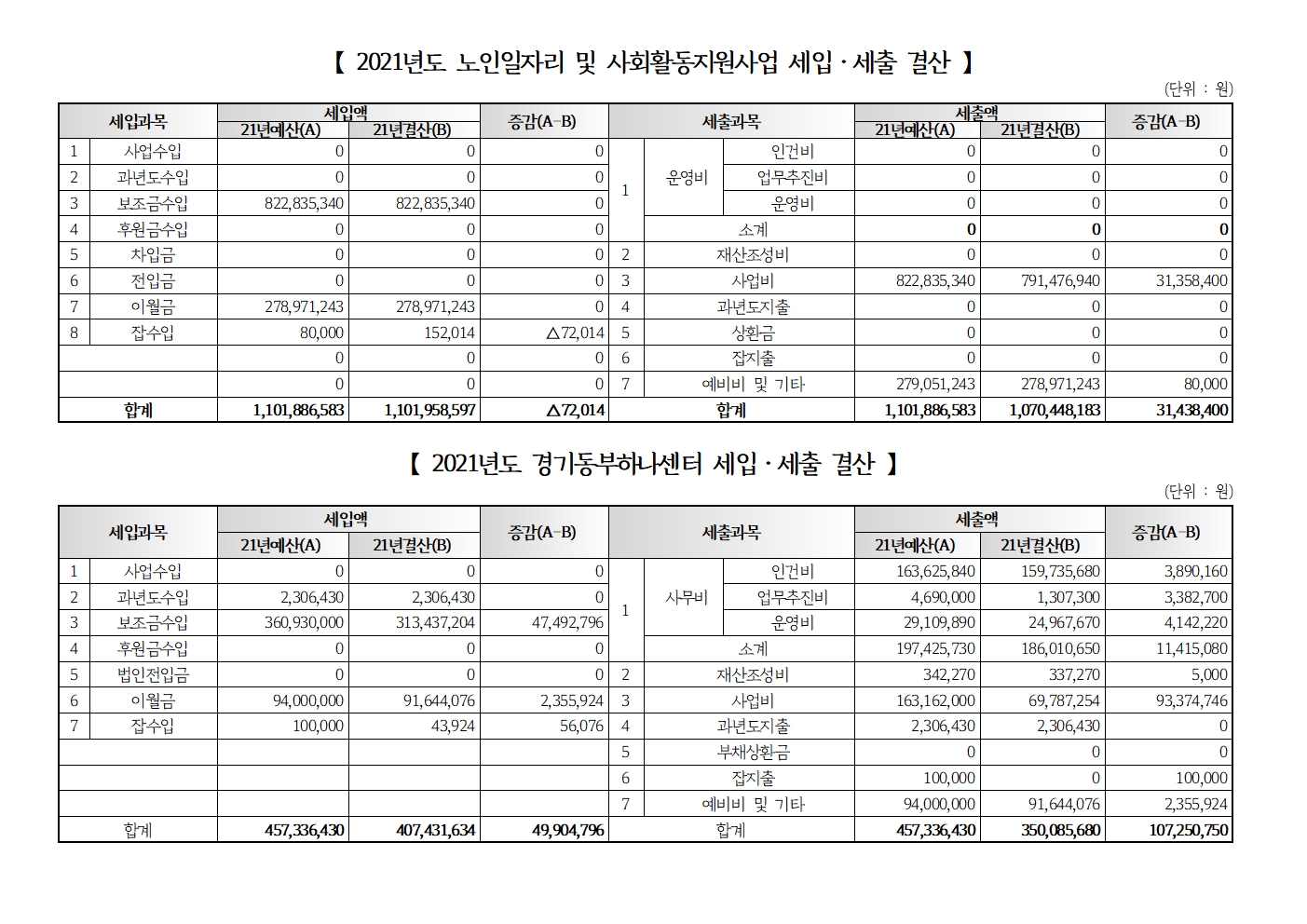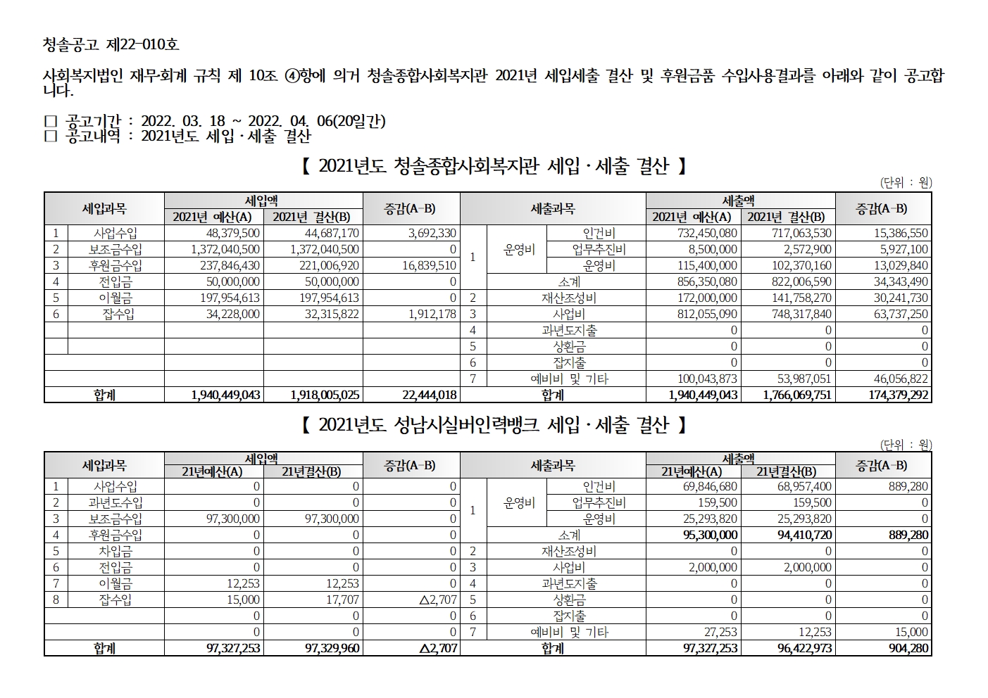 »çȸº¹Áö¹ýÀÎ À繫․ȸ°è ±ÔÄ¢ Á¦ 10Á¶ ¨êÇ׿¡ ÀǰŠû¼ÖÁ¾ÇÕ»çȸº¹Áö°ü 2021³â ¼¼ÀÔ¼¼Ãâ °á»ê ¹× ÈÄ¿ø±Ýǰ ¼öÀÔ»ç¿ë°á°ú¸¦ ¾Æ·¡¿Í °°ÀÌ °ø°íÇÕ´Ï´Ù.