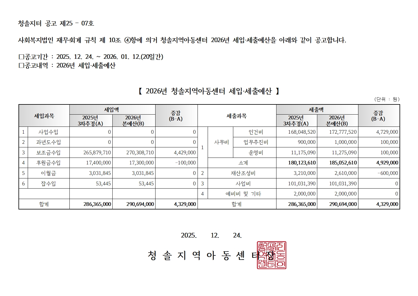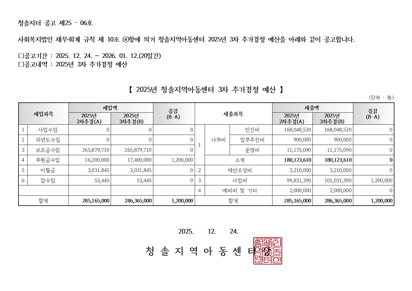 û¼ÖÁö¿ª¾Æµ¿¼¾ÅÍ 2025³â 3Â÷ Ãß°¡°æÁ¤ ¿¹»ê ¹× 2026³â ¼¼ÀÔ¼¼Ãâ ¿¹»ê °ø°í [û¼ÖÁöÅͰø°í Á¦25-06È£, Á¦25-07È£]