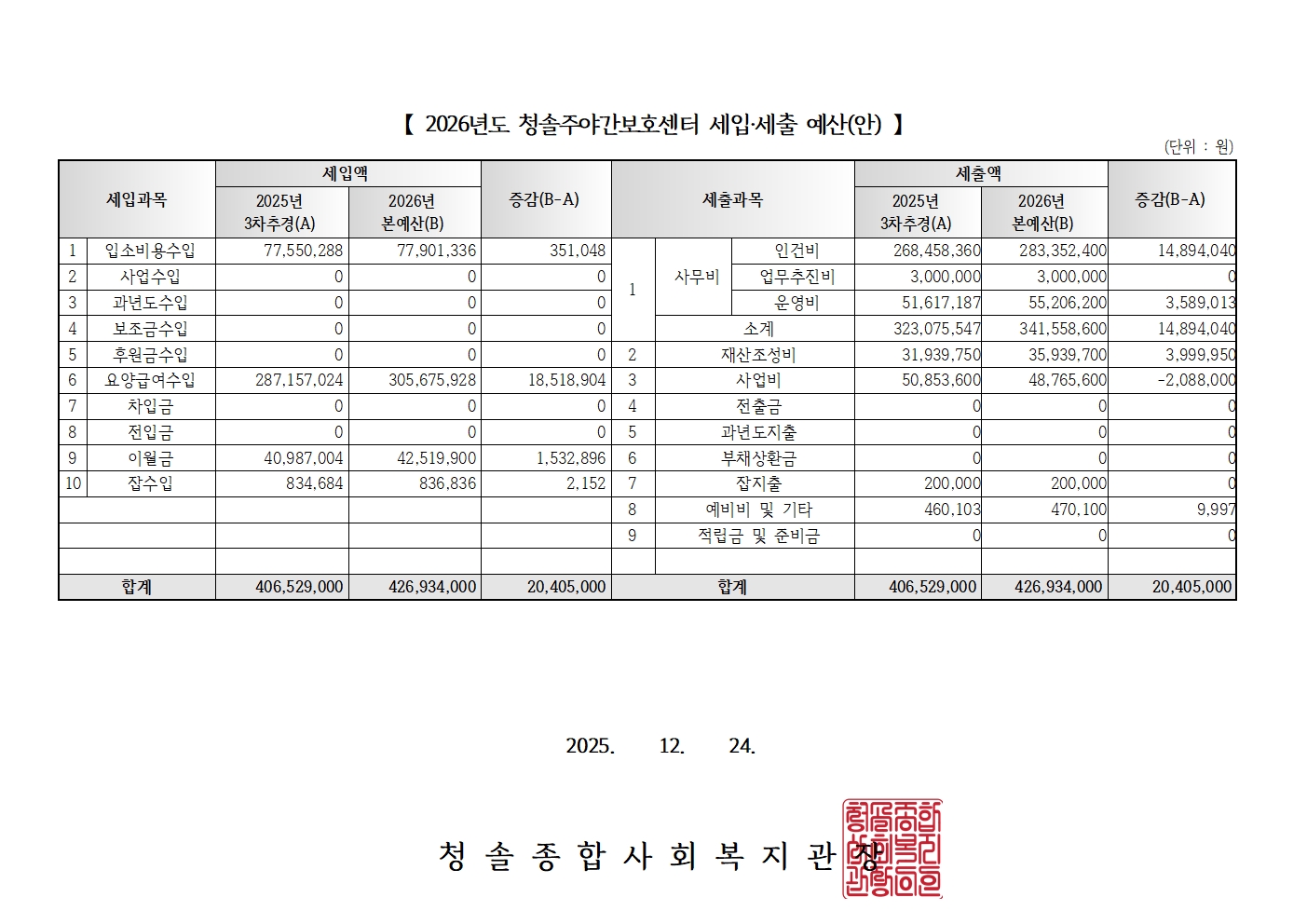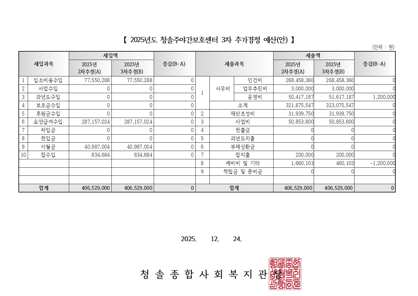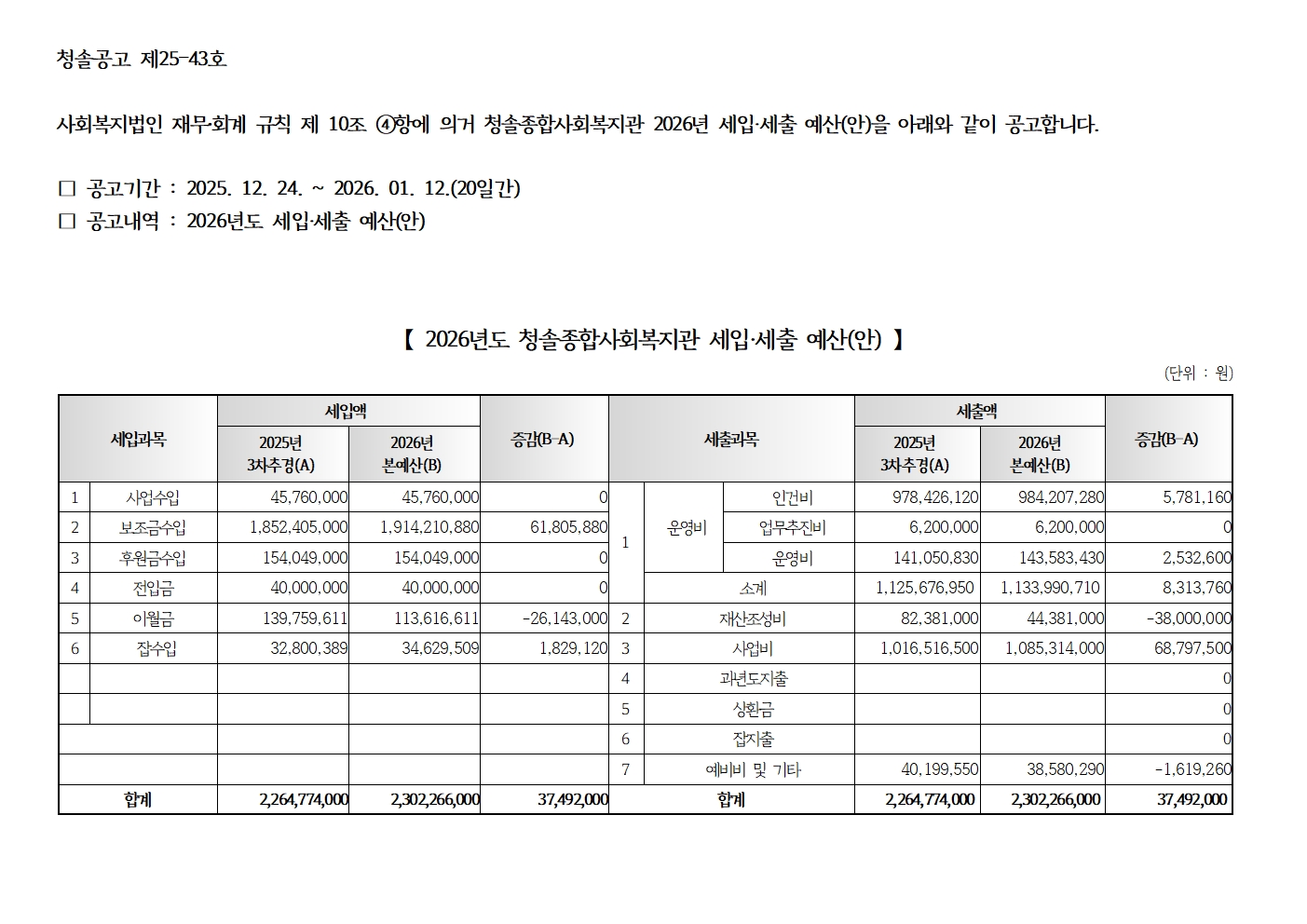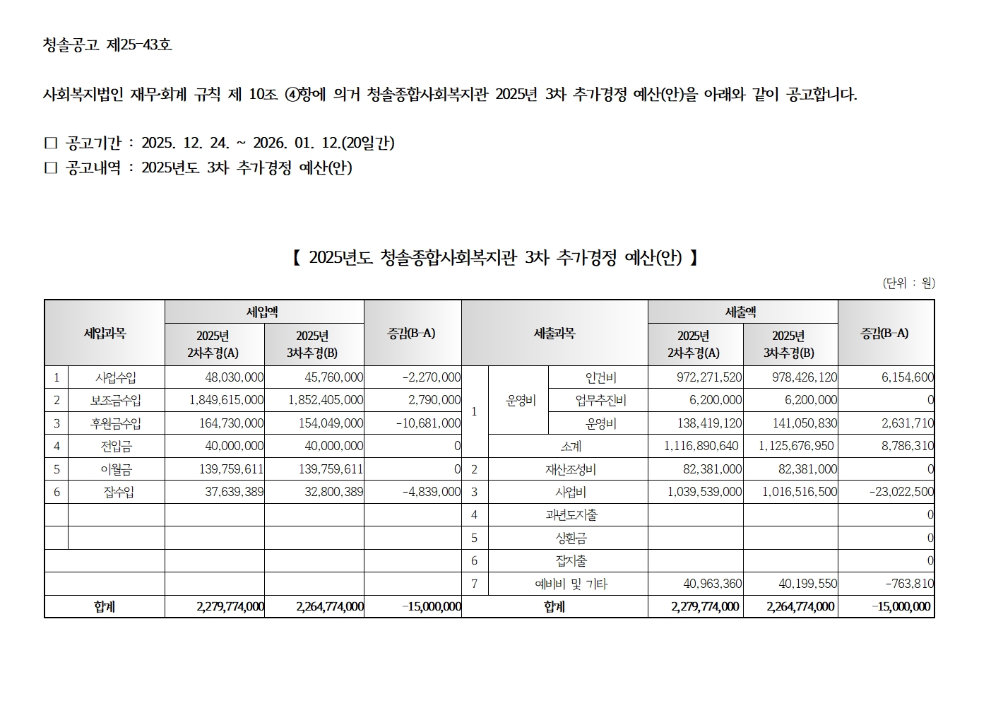 [û¼Ö°ø°í Á¦25-043È£] 2025³â º¹Áö°ü ¹× ºÎ¼³¼¾ÅÍ 3Â÷ Ãß°¡°æÁ¤ ¿¹»ê(¾È) ¹× 2026³â ¼¼ÀÔ¼¼Ãâ ¿¹»ê(¾È) °ø°í